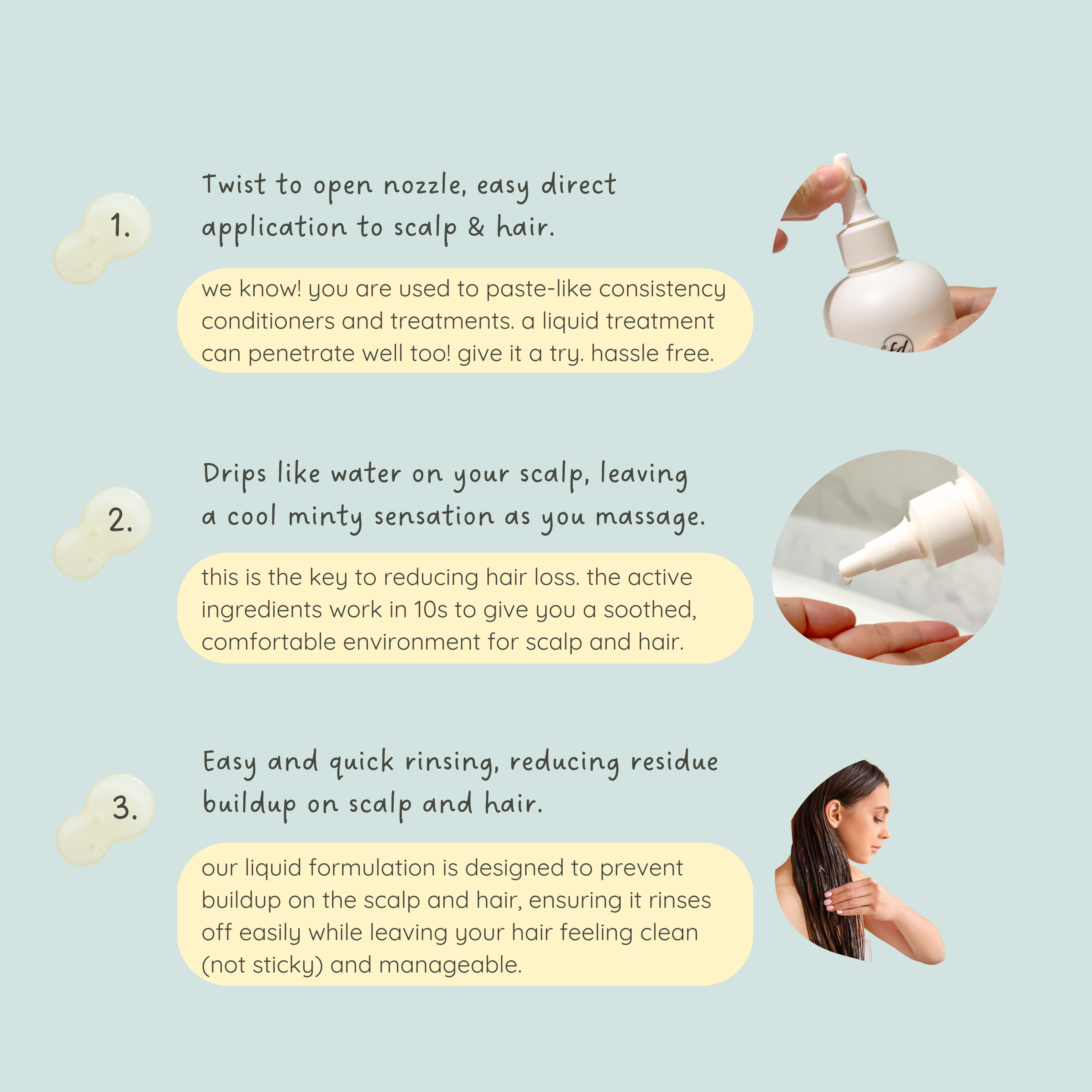 What sets us apart further is our non-sulphate shampoo. Our non-sulphate shampoo is thoughtfully formulated to provide a comfortable, concentrated foamy texture that cleans thoroughly without overstripping your scalp and hair’s natural oils. It offers gentle yet effective care for a healthier hair journey! And don’t forget our liquid treatment, offering almost instant relief for those with itchy and sensitive scalps.